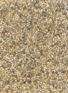 Canaryseed (50%), White French Mil- let, Panorama, Jap Millet, Panicum, Shirohie Millet, Red Panicum and/or BUDGIE Hulled Oats