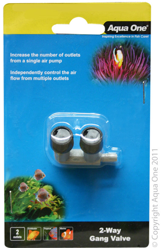 Use Aqua One airline gang valves to increase the number of outlets from a single air pump and to individually control the air flow from multiple outlets.
