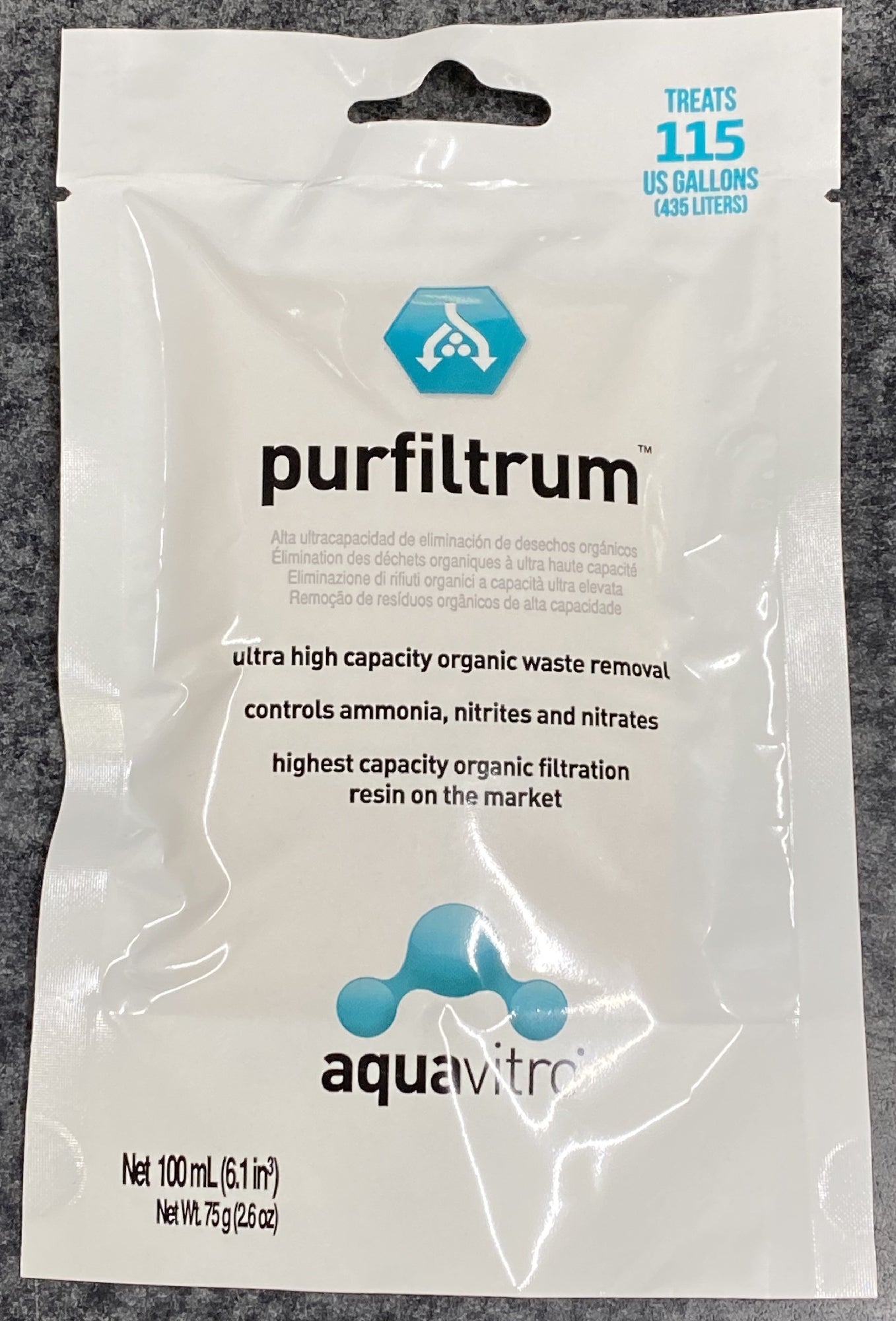purfiltrum™ is a unique macro-porous synthetic polymer that removes soluble and insoluble organic impurities from water 5 to 10 times faster and more completely than all other competing products. It is the highest capacity organic filtration resin on the market outperforming even Seachem Purigen®, binding 10 to 15% more organic material. purfiltrum™ controls ammonia, nitrites and nitrates by removing nitrogenous organic waste that would otherwise be converted into these harmful chemicals. purfiltrum™ will not reduce the levels of trace elements, and it significantly raises redox. It polishes water to unparalleled clarity. purfiltrum™ progressively darkens as it removes impurities, and is easily renewed by treating with bleach per recommended regeneration instructions. purfiltrum™ is designed for both marine and freshwater use.